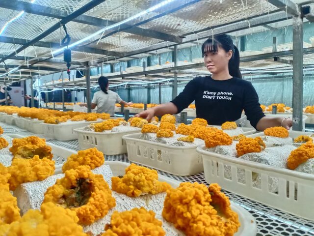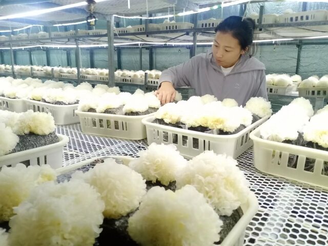 工作人員正在采摘金耳菌、銀耳菌。