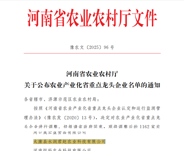 太康縣水潤(rùn)君趙農(nóng)業(yè)科技有限公司被河南省農(nóng)業(yè)農(nóng)村廳評(píng)為農(nóng)業(yè)產(chǎn)業(yè)化省重點(diǎn)龍頭企業(yè)。